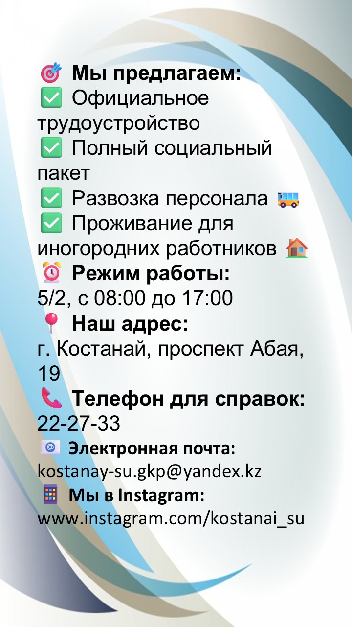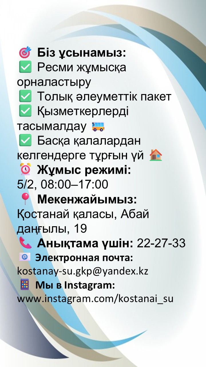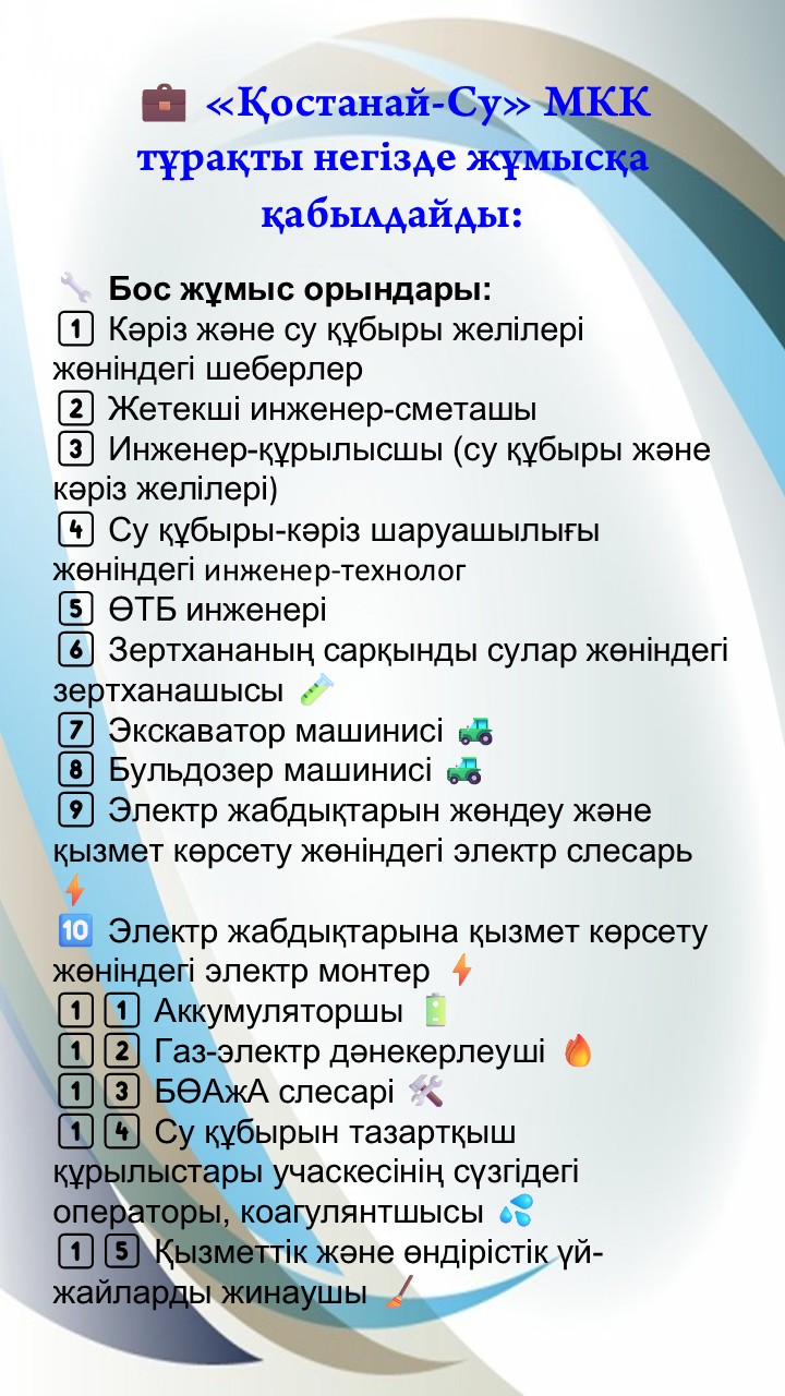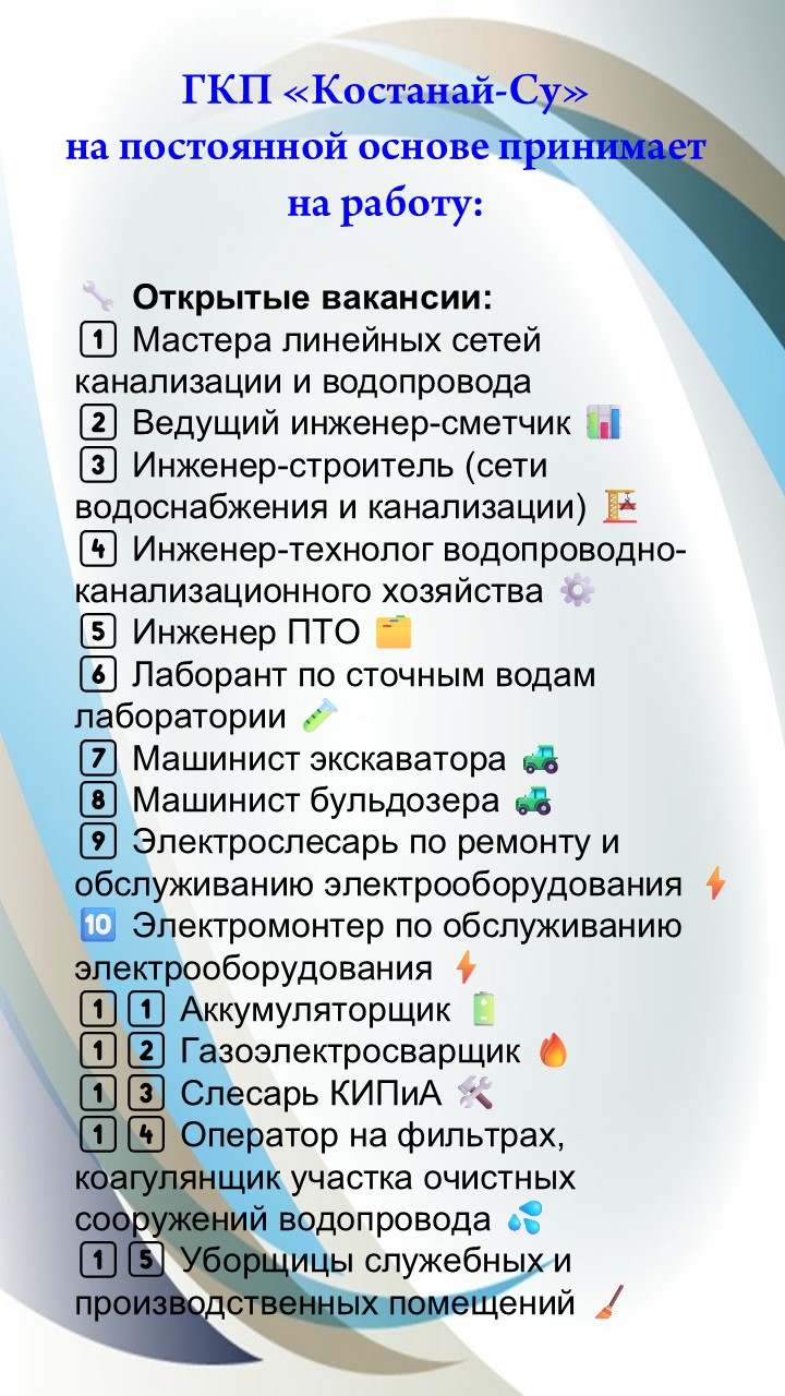 ГКП «Костанай-Су» на постоянной основе принимает на работу специалистов